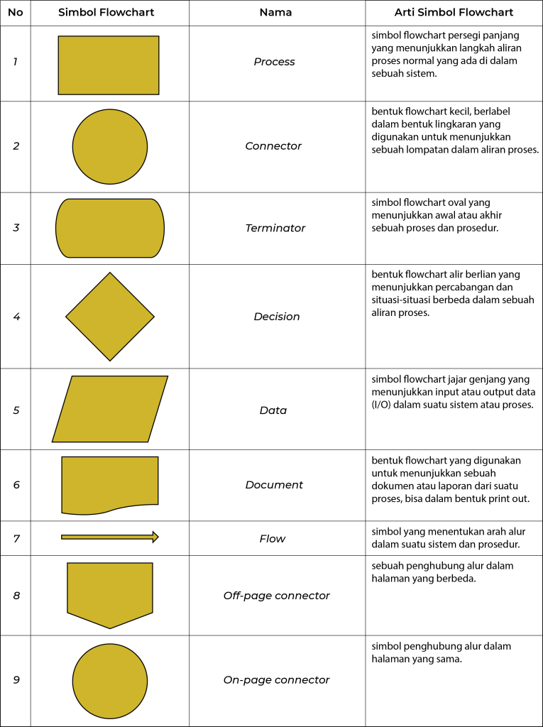 Dalam pembuatan flowchart, terdapat berbagai simbol yang digunakan untuk menggambarkan langkah-langkah dan alur proses. Berikut adalah beberapa simbol flowchart yang umum digunakan: