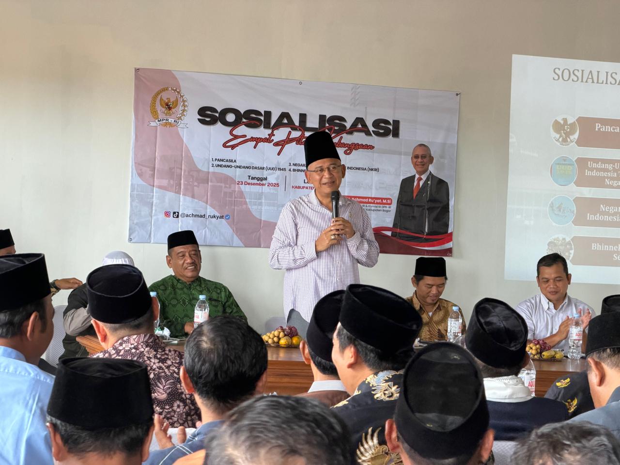 HALO NUSANTARA – BOGOR, Dalam upaya memperkokoh nilai-nilai kebangsaan di lingkungan pendidikan, Anggota MPR RI Fraksi PKS, H. Achmad Ru’yat, M.Si., menggelar kegiatan Silaturahmi sekaligus Sosialisasi 4 Pilar MPR RI bertempat di Aula SDIT Umar Al Faruq (UMFAR), Desa Waru, Kecamatan Parung, Kabupaten Bogor, Selasa (23/12/2025).