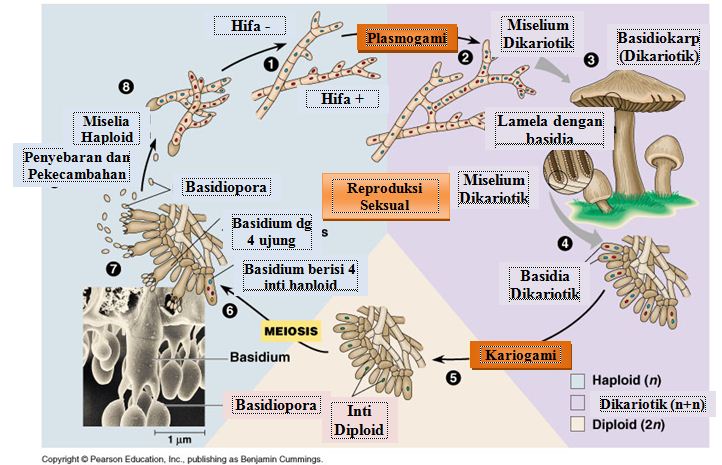 Sel dikariotik ini akan berkembang menjadi miselium dikariotik yang akhirnya membentuk tubuh buah (basidiokarp). Di dalam basidiokarp, basidium terbentuk dan mengandung dua inti (2n). Kedua inti ini akan mengalami meiosis, menghasilkan empat inti haploid. Masing-masing inti haploid akan tumbuh menjadi spora seksual (basidiospora) yang siap menyebar dan memulai siklus hidup baru.
